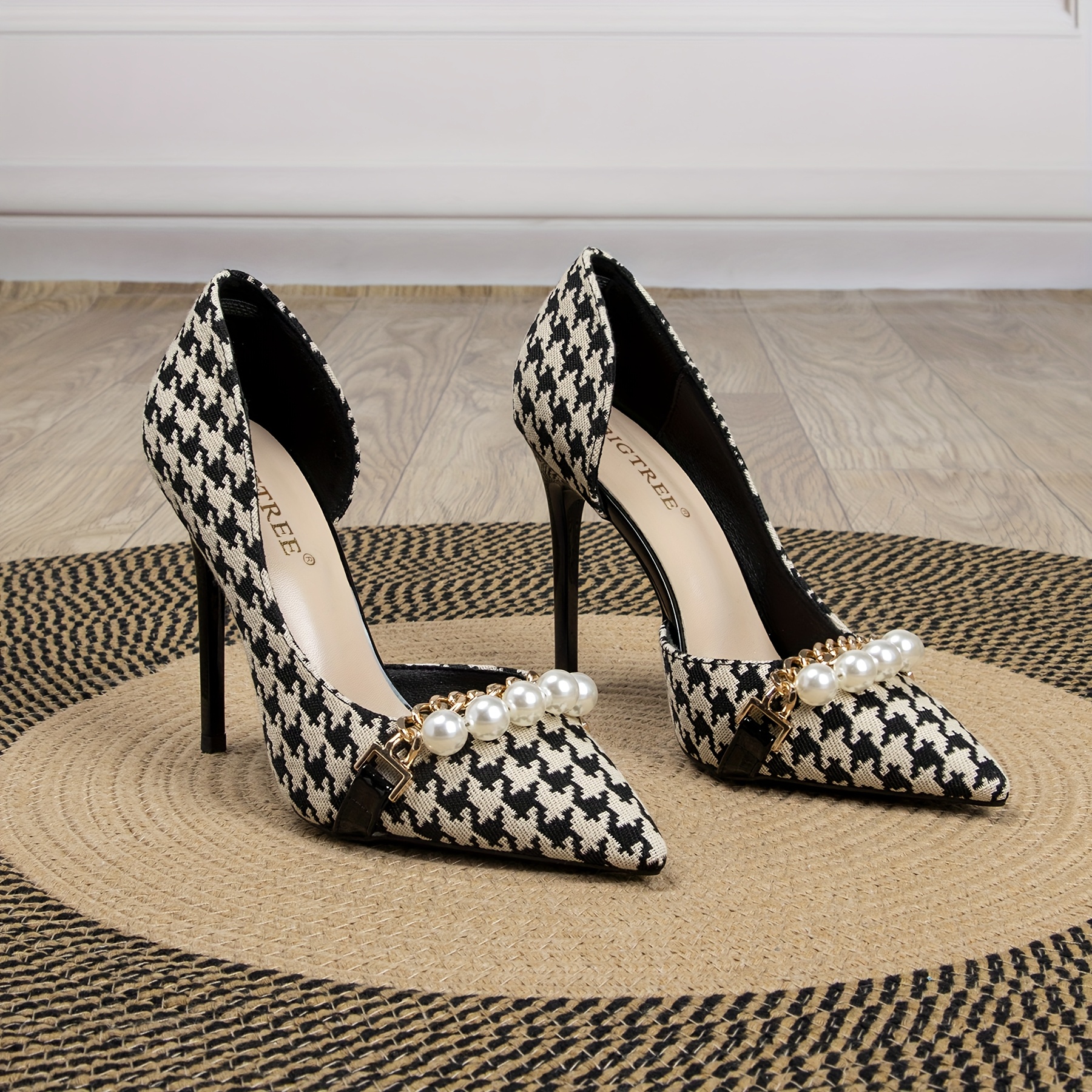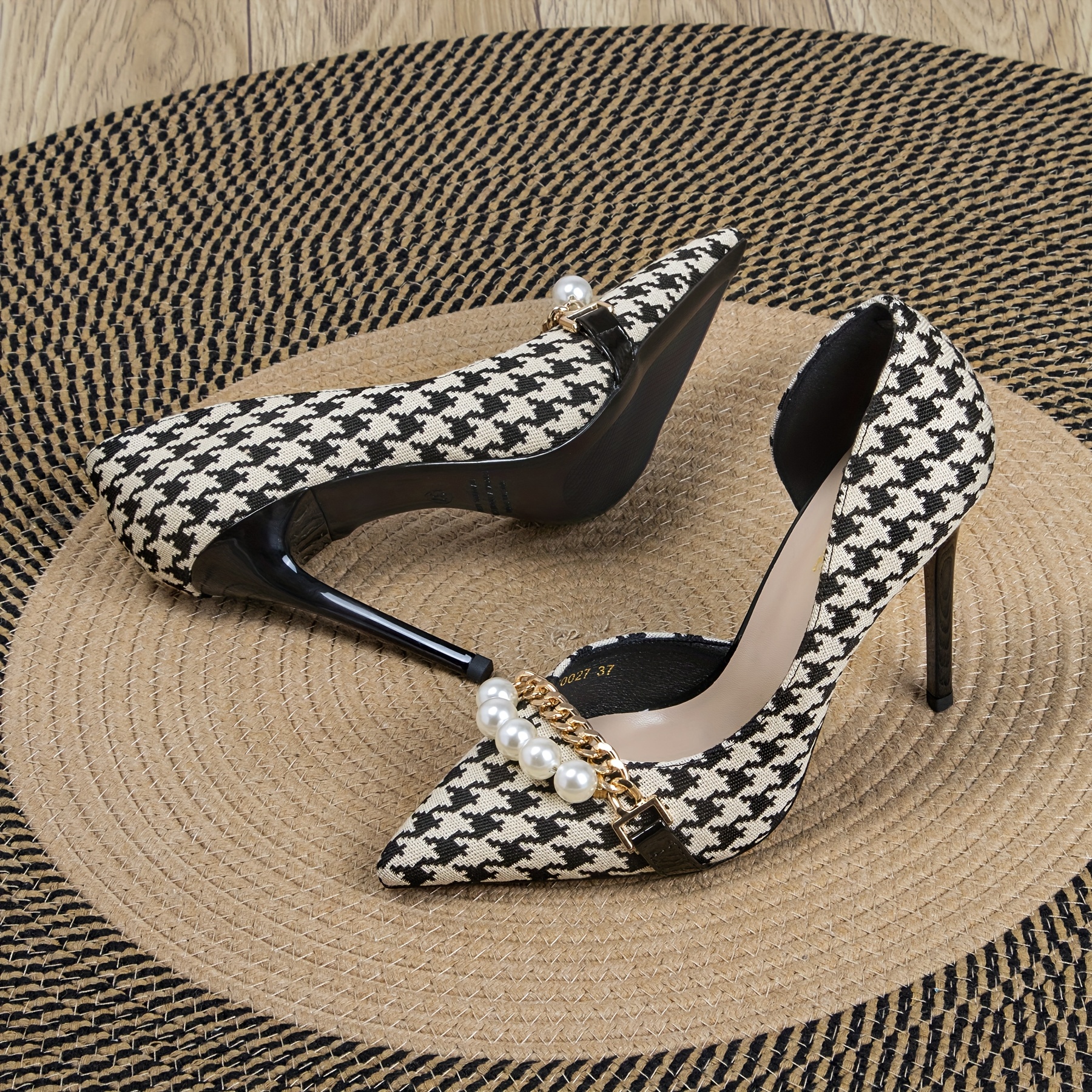 Women's Elegant Black Stiletto Heel Pumps, Thousand Bird Plaid Pattern Pattern Collocation Dazzling Faux Pearl and Metal Chain Decor, Wedding Evening Dress Office Party Dating Shoes, Eye-catching Heel, Perfect for The Modern Woman